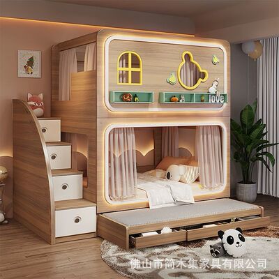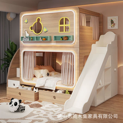 原木色儿童床上下床高低床简约现代带梯柜子母床滑梯双层床组合床