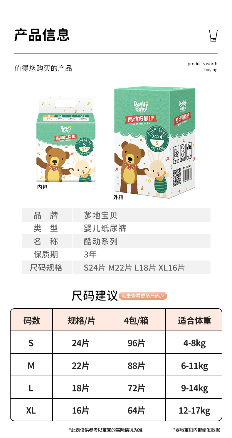 商品名称:爹地宝贝婴儿尿裤 酷动纸尿裤单包 宝宝尿不湿 S/M/L/XL