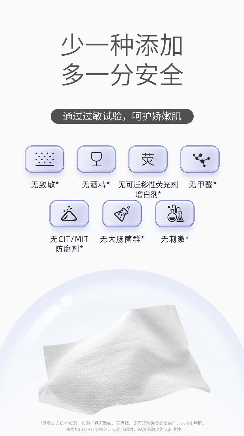 材质:柔软水刺无纺布、EDI纯化水、甘油、洋甘菊提取液
