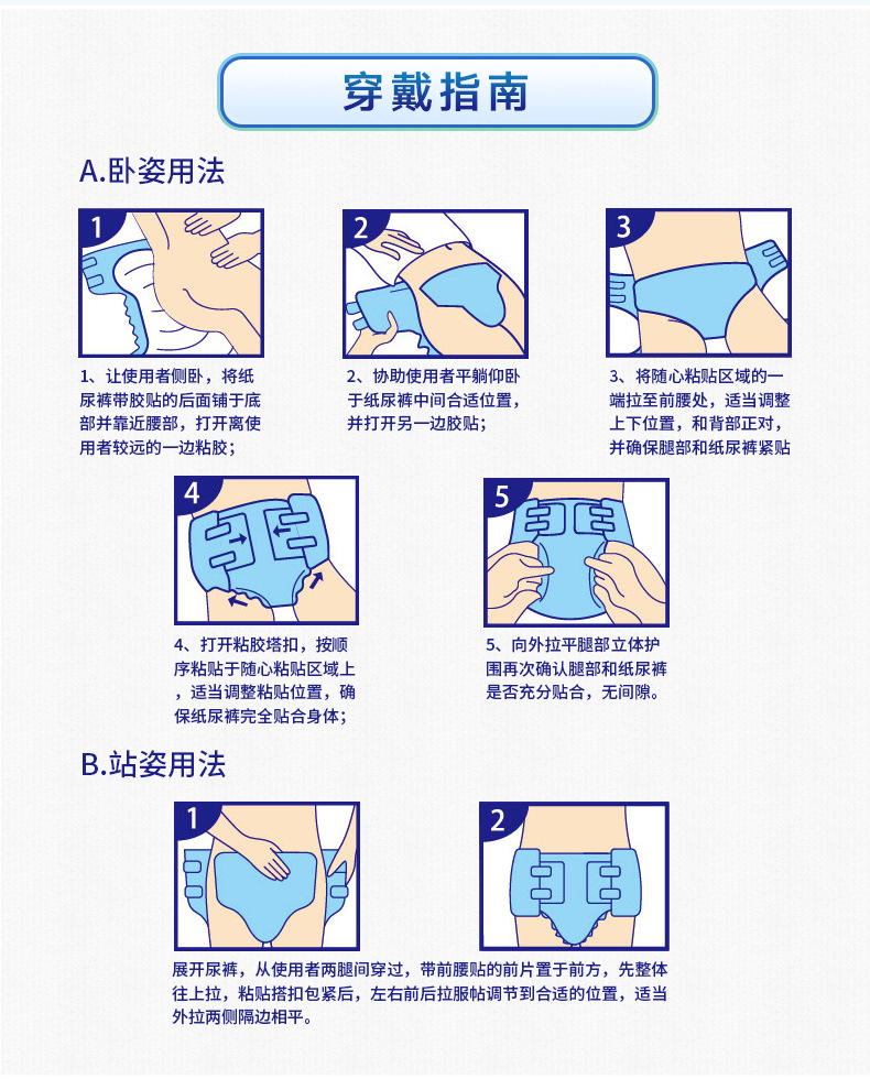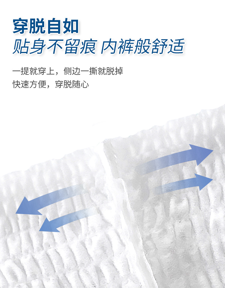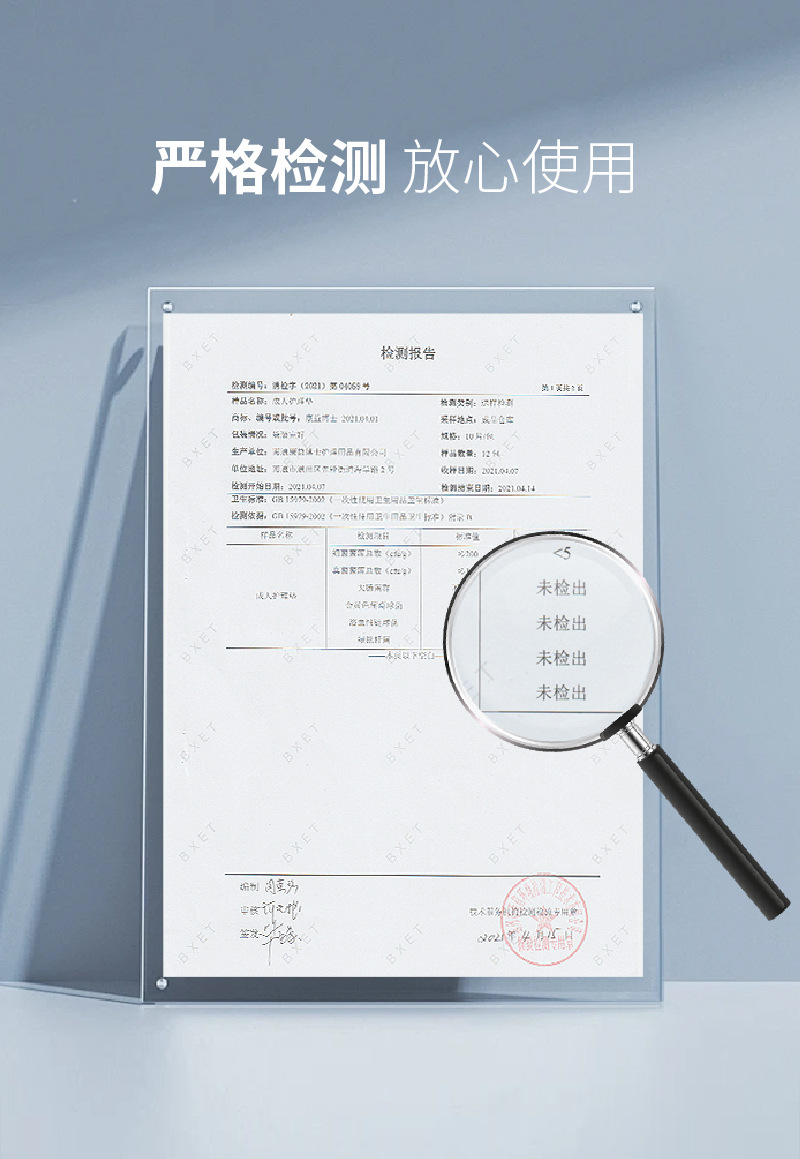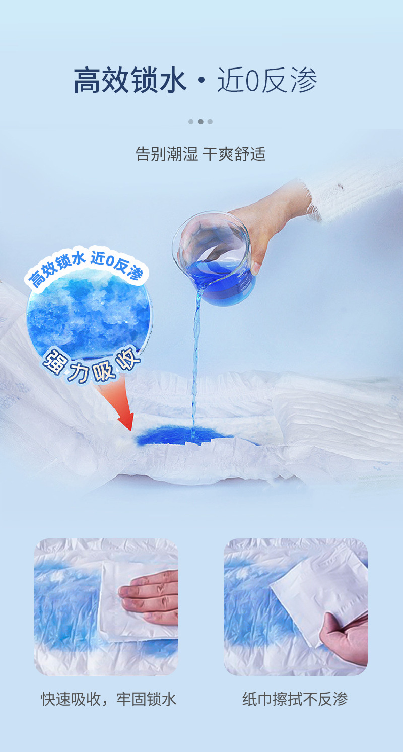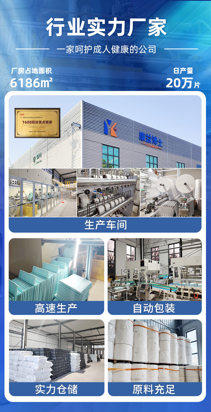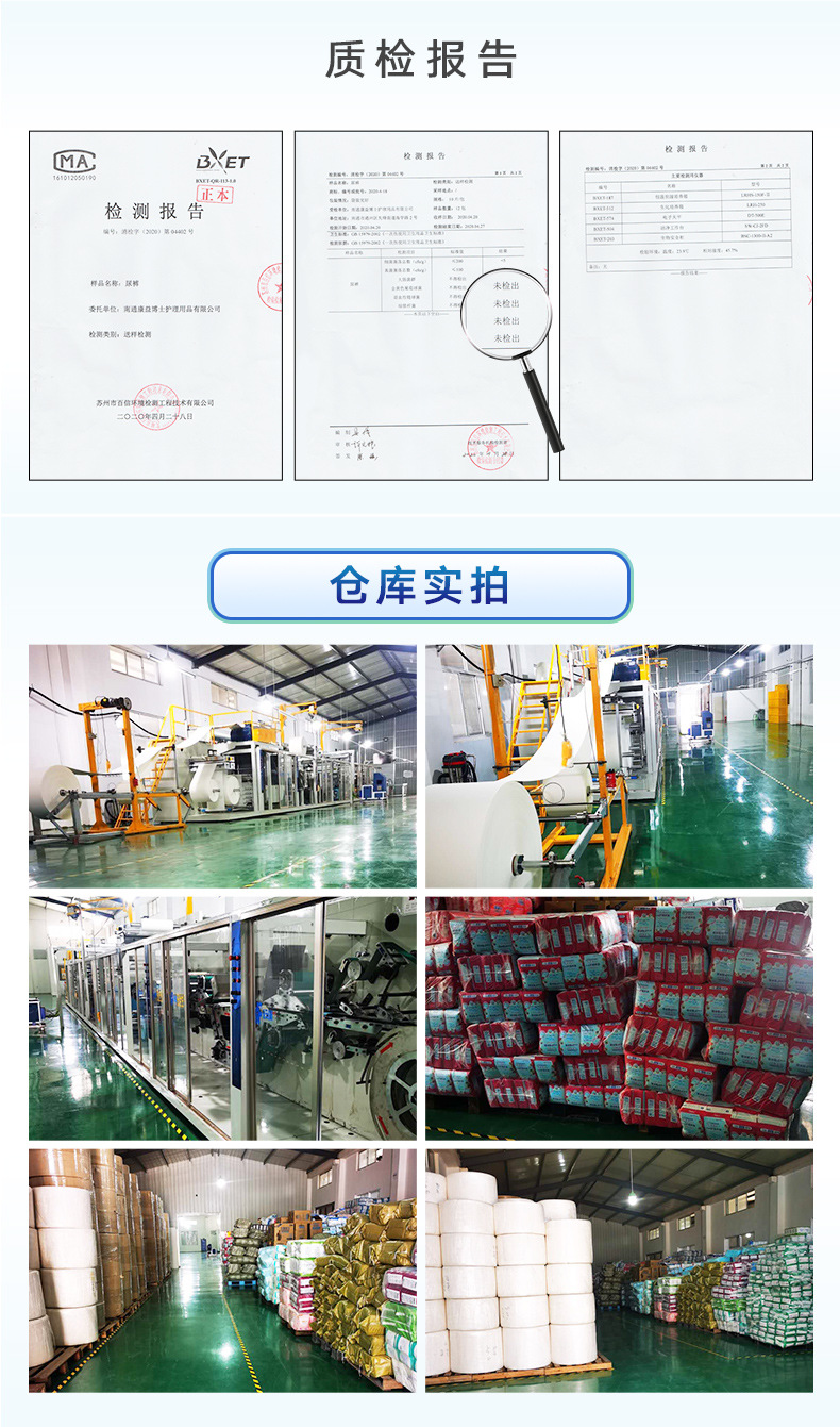 本产品为进口卷桨生产,表层:无纺布。吸收层:吸水纸。棉状木浆和进口高分子吸水颗粒;防水外层:PE防