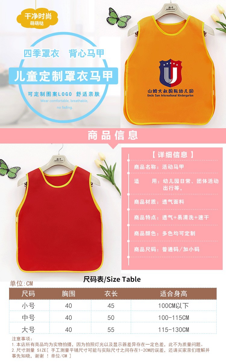 商品名称:幼儿园早教户外马甲背心LOGO儿童培训班亲子活动套头罩衣围兜