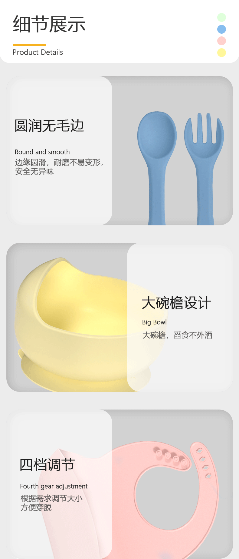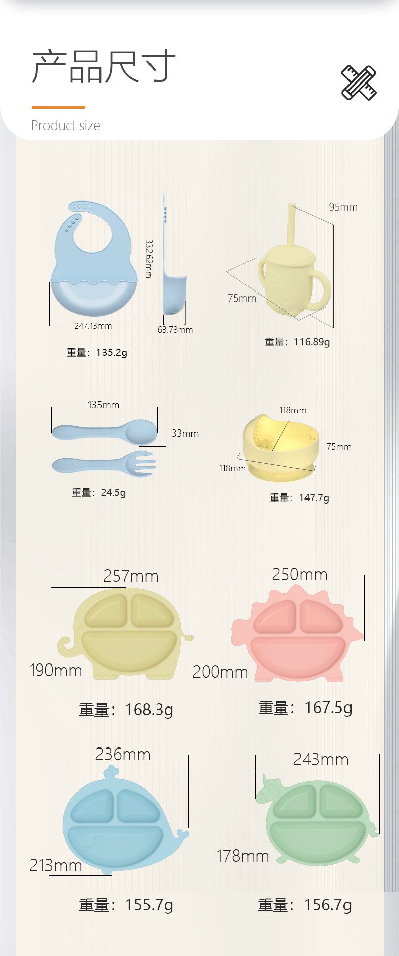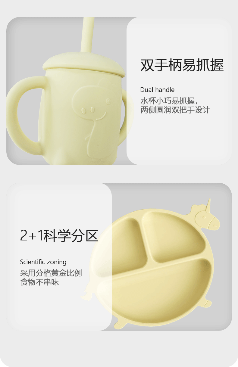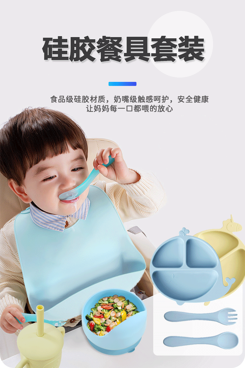 内含:硅胶餐盘 硅胶辅食碗 围兜 叉子 勺子 水杯