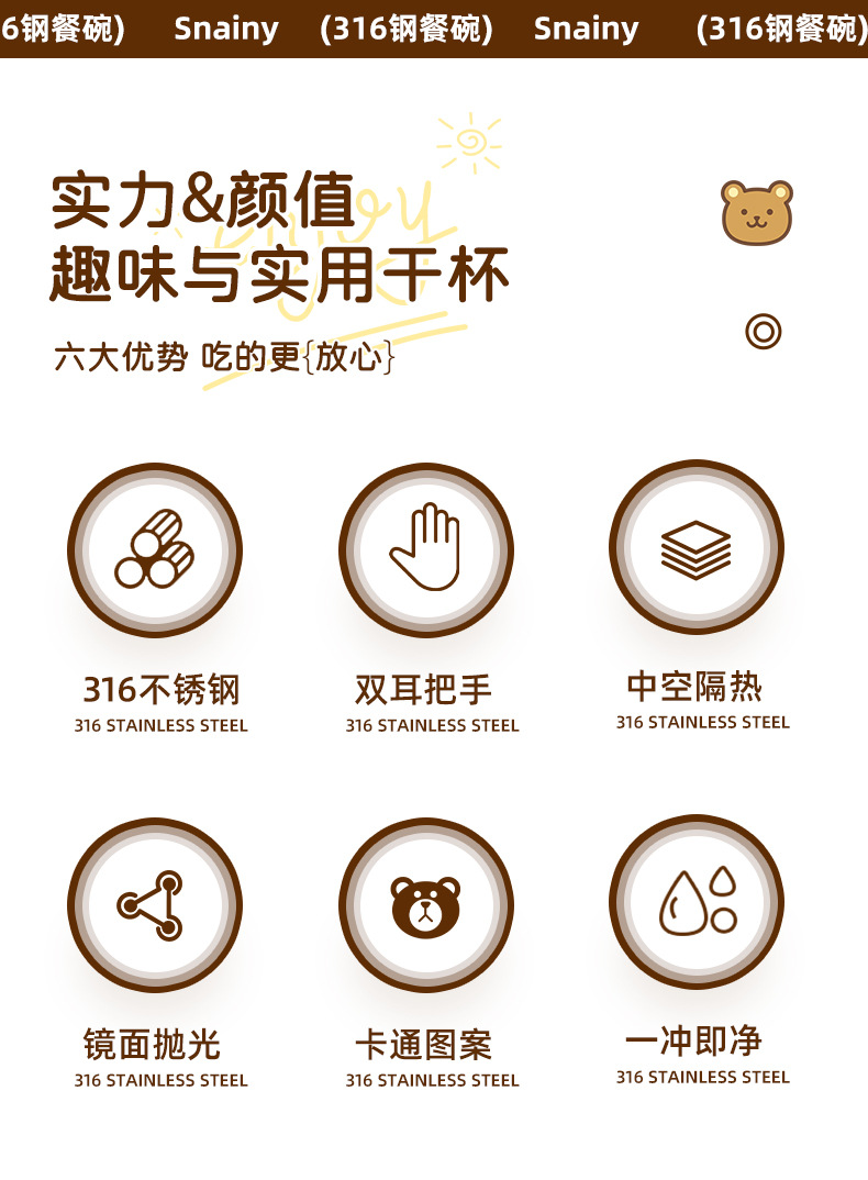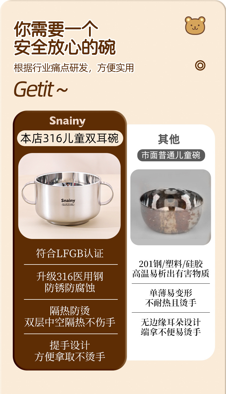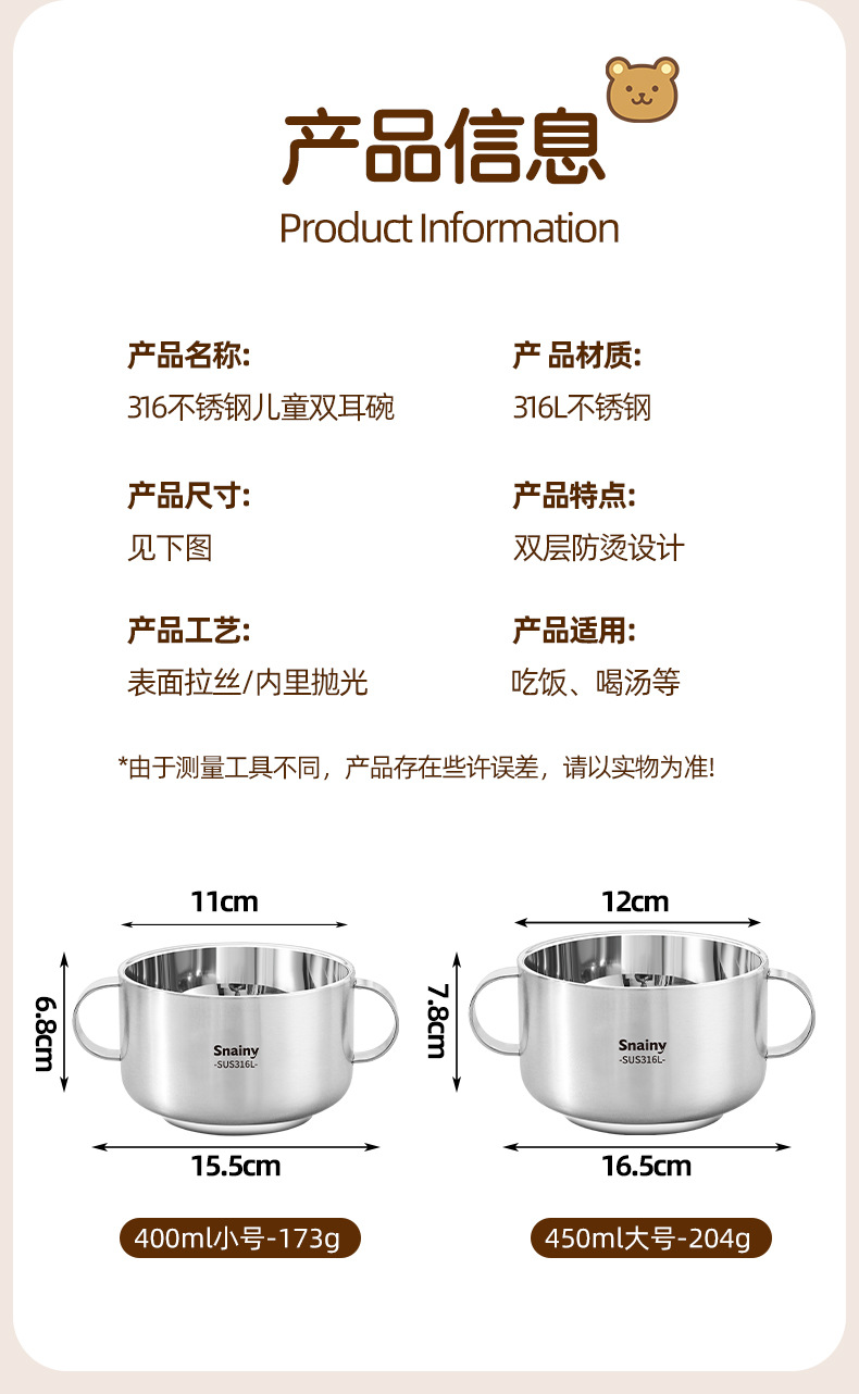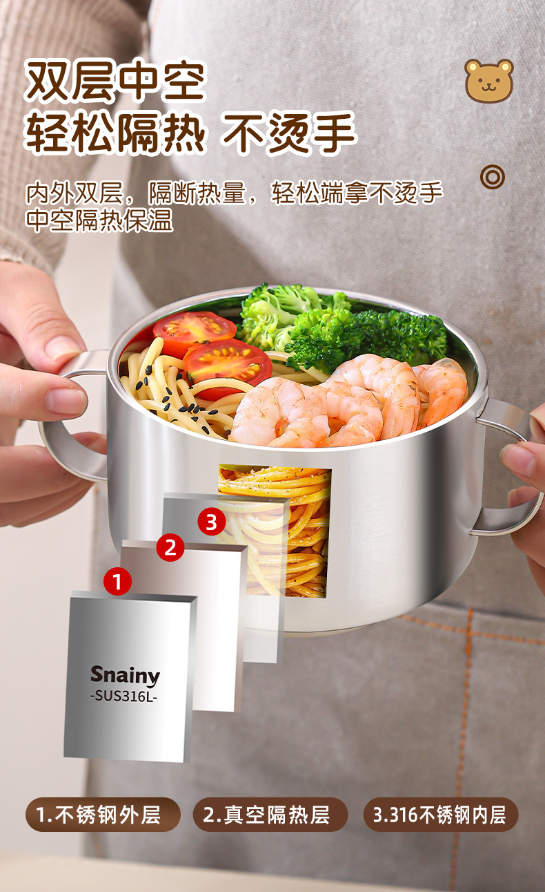商品名称:316不锈钢儿童碗宝宝吃饭专用辅食碗食品级饭碗防摔防烫双耳汤碗