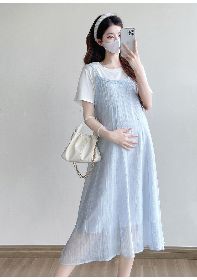 孕妇连衣裙2025新款夏季韩版时尚宽松显瘦洋气时髦假两件吊带裙