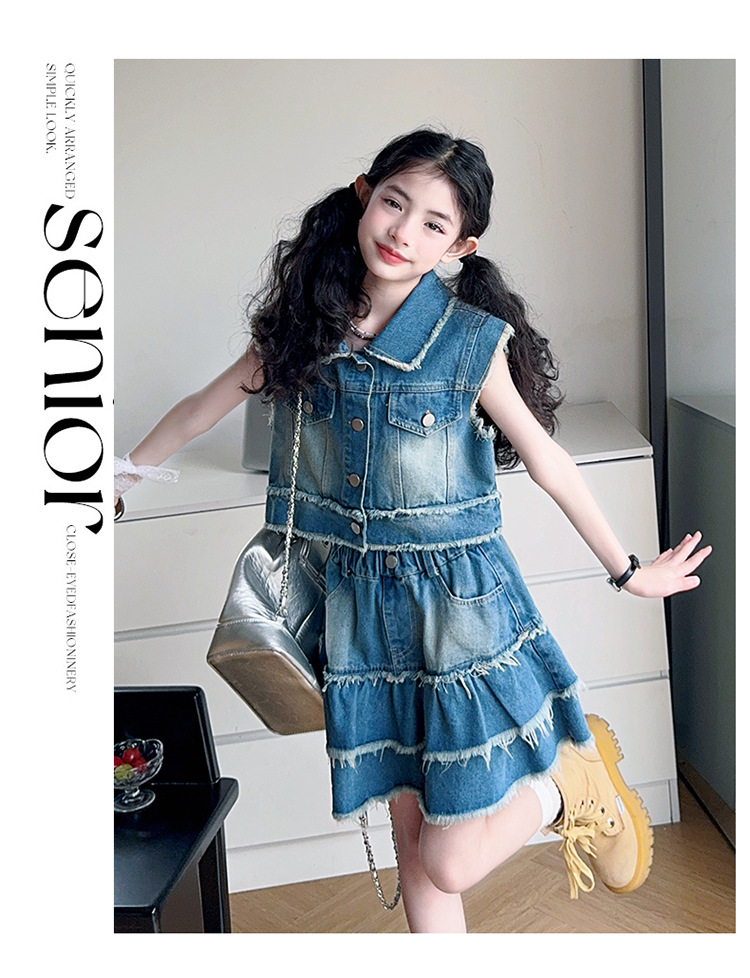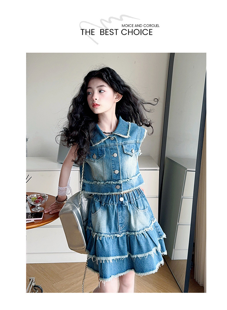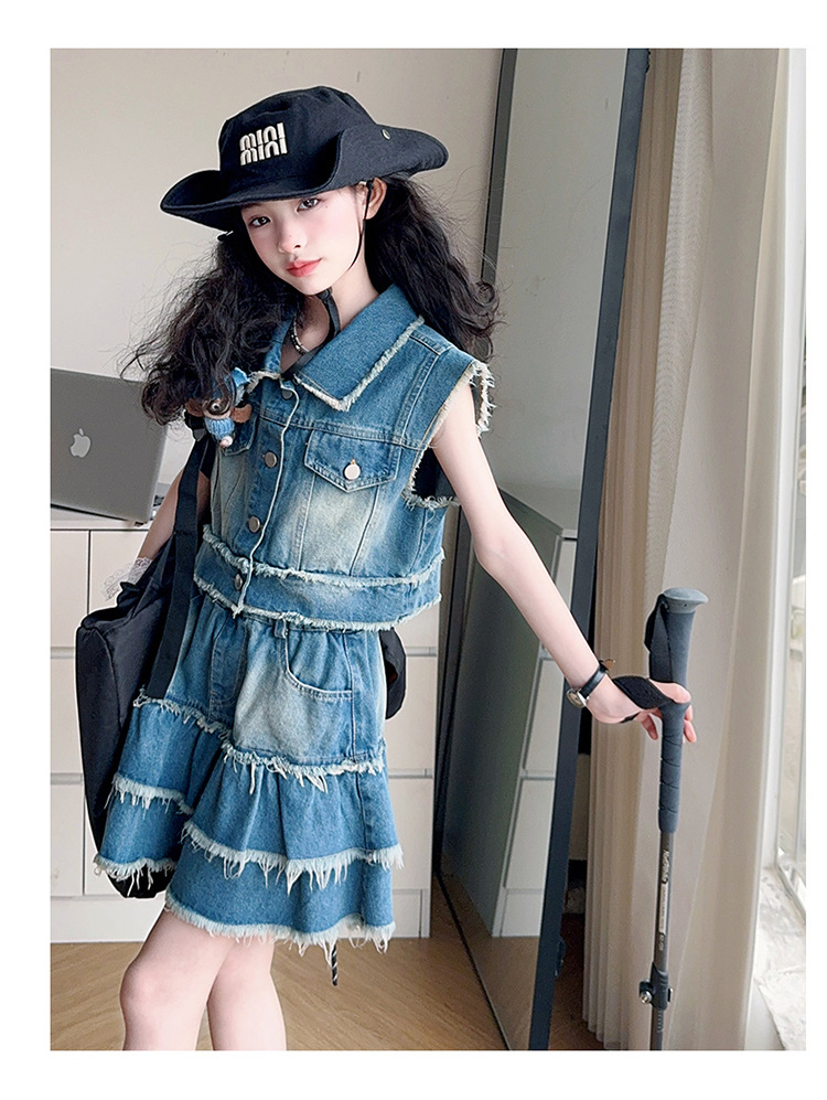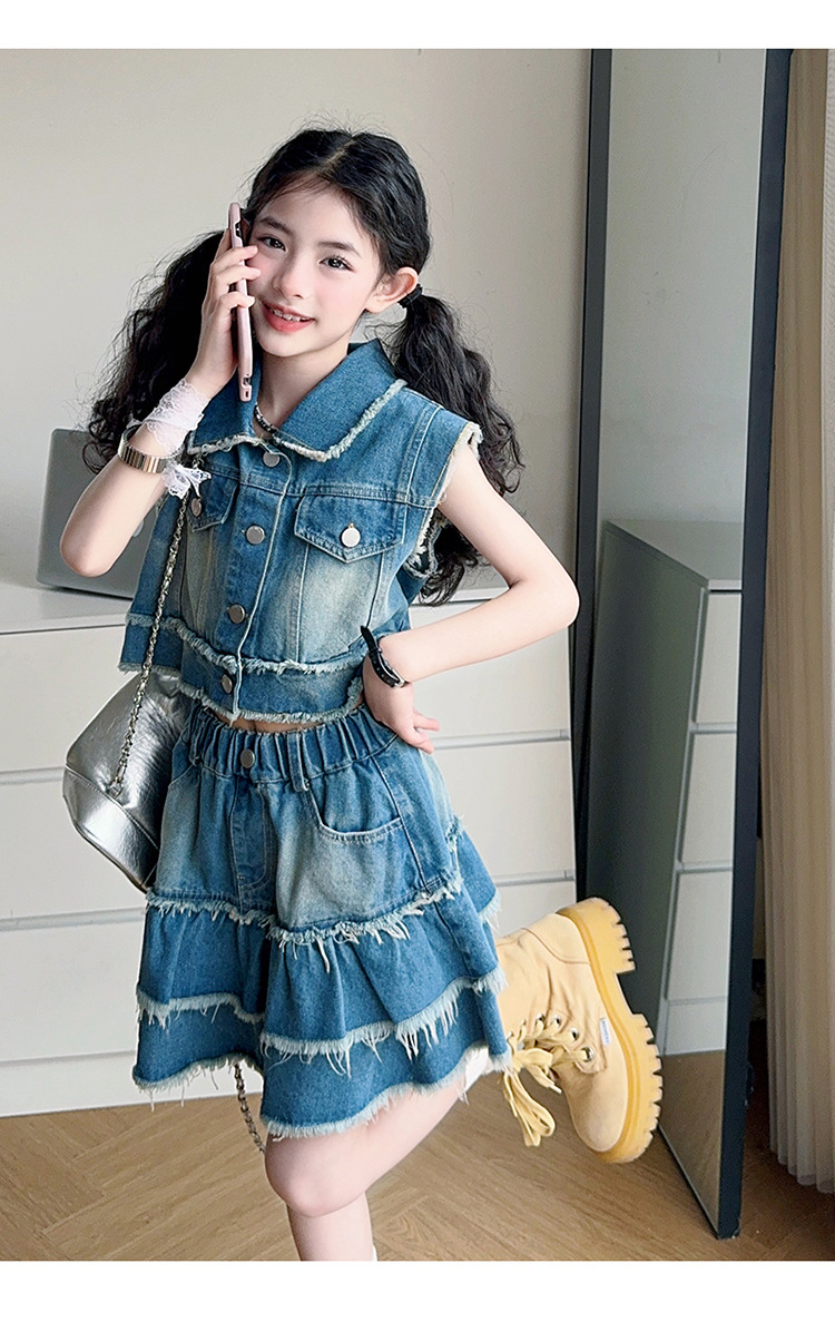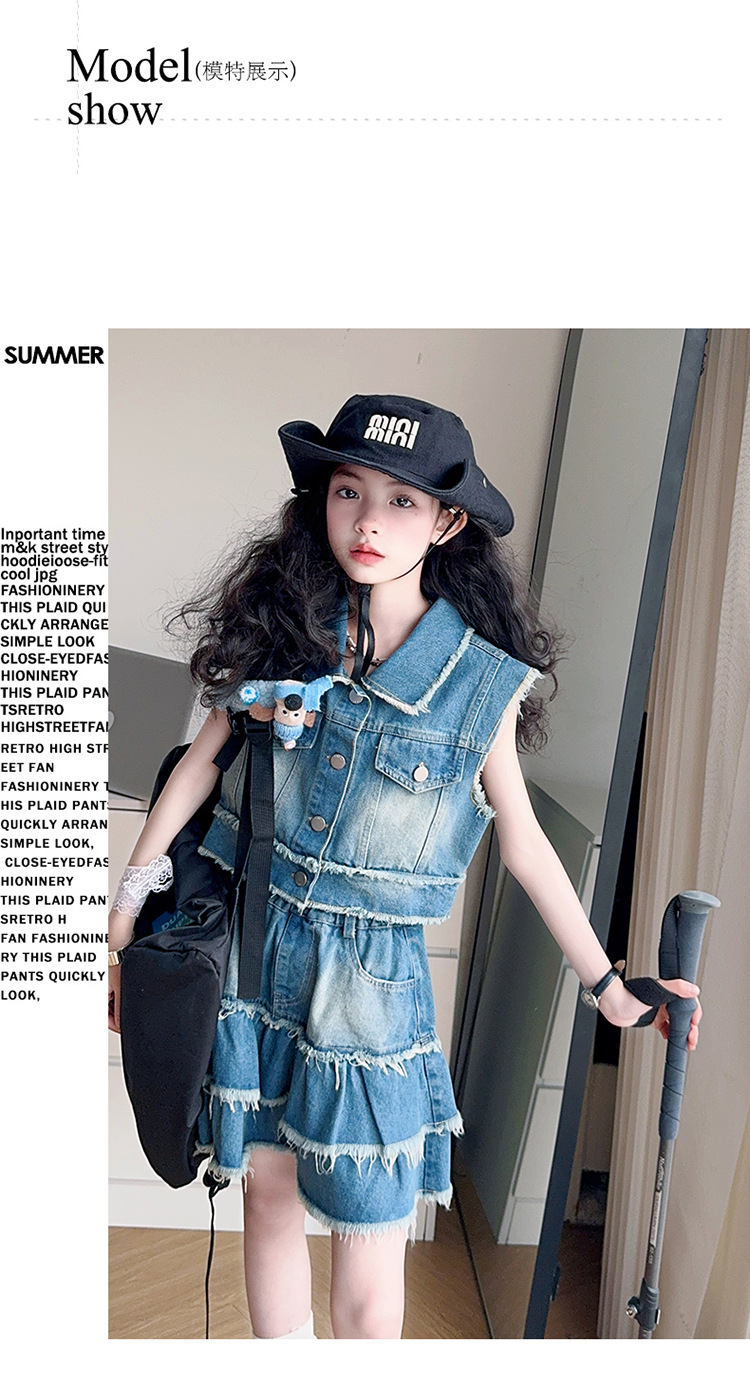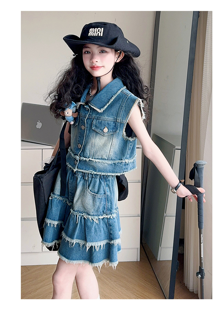 女童夏季牛仔套装2025新款儿童夏装时髦毛边马甲半身裙潮酷两件套