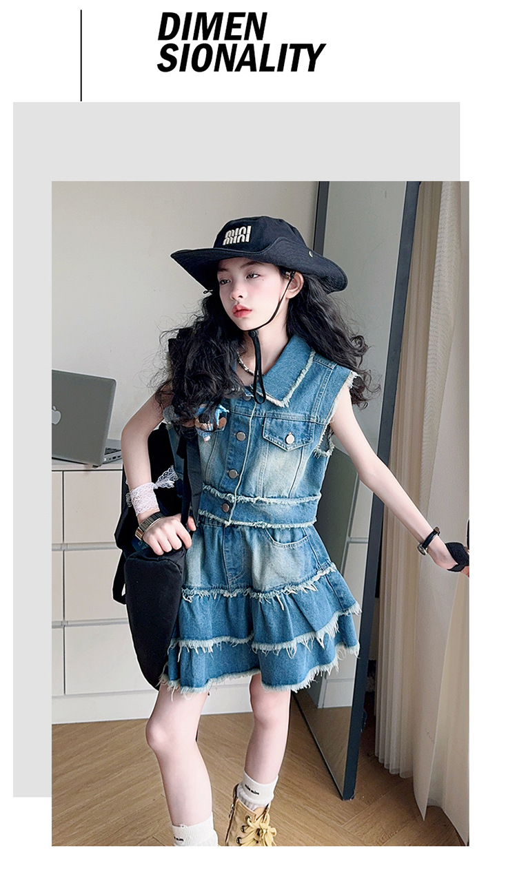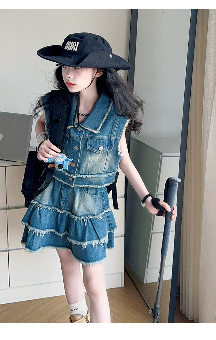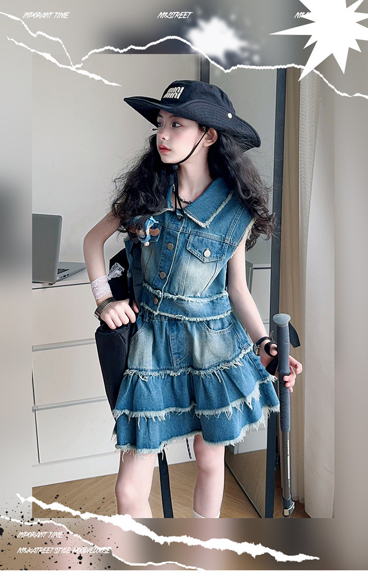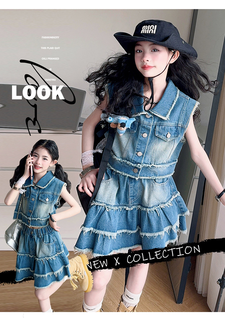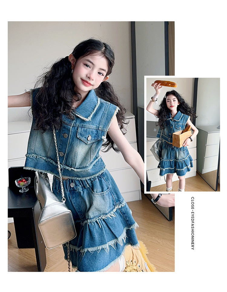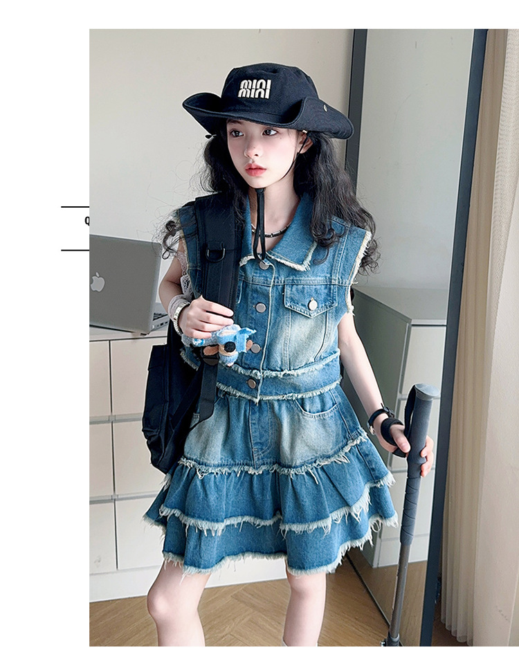 女童夏季牛仔套装2025新款儿童夏装时髦毛边马甲半身裙潮酷两件套