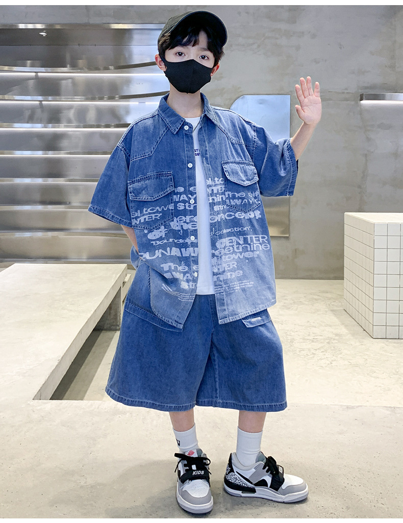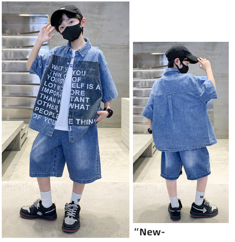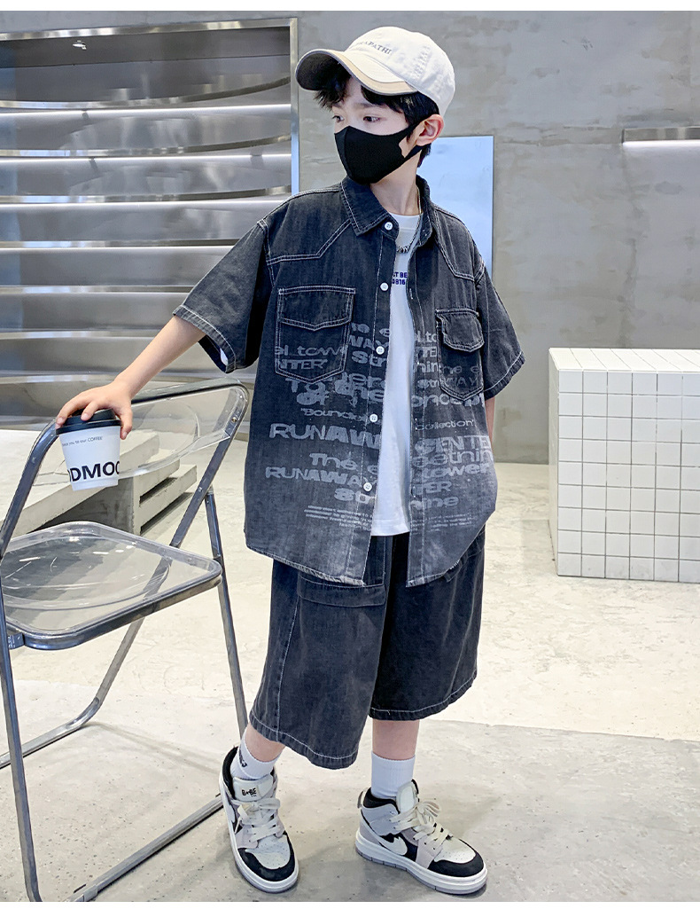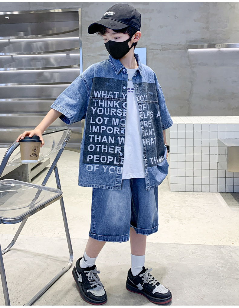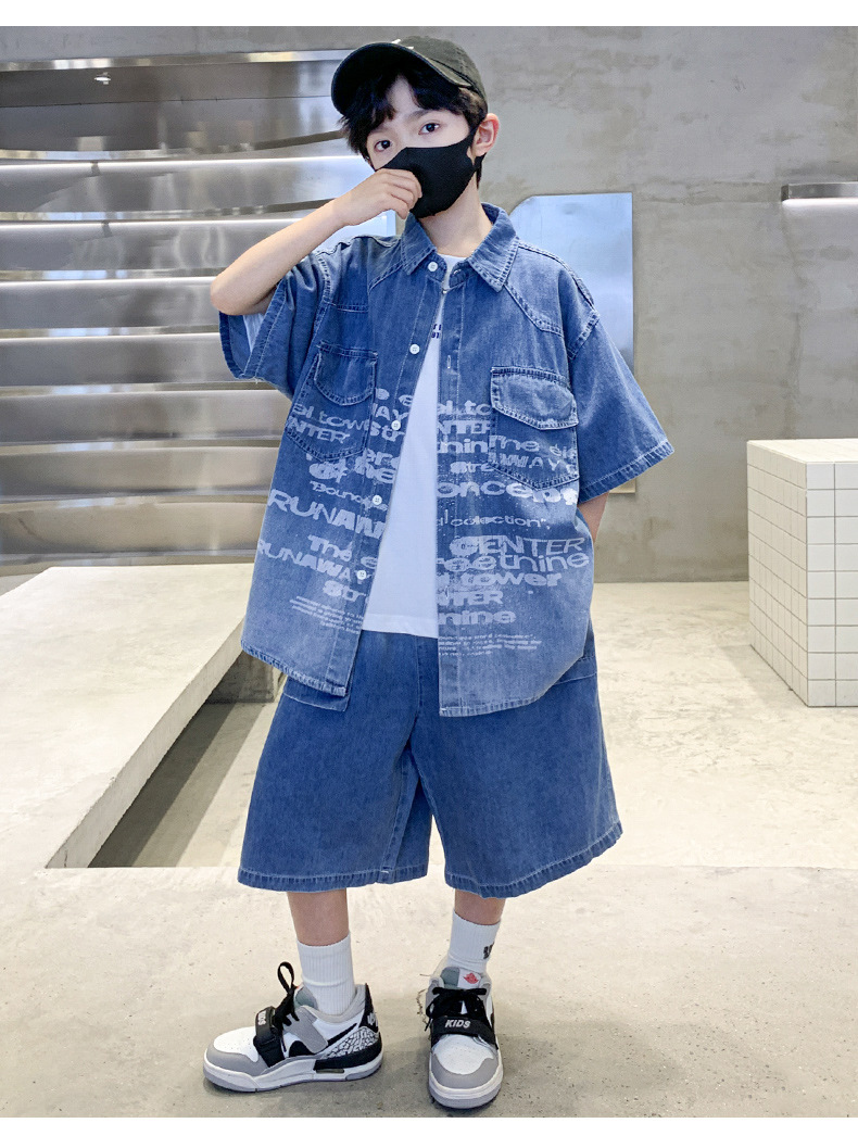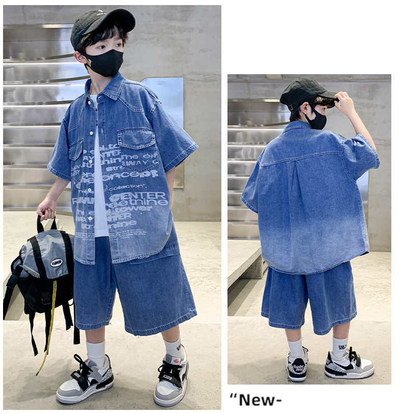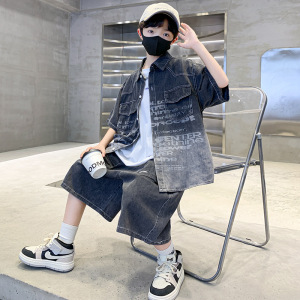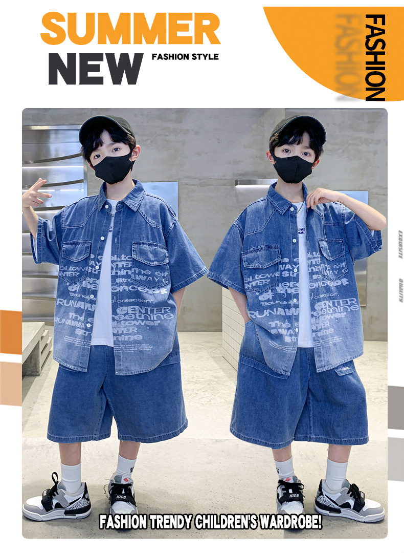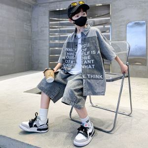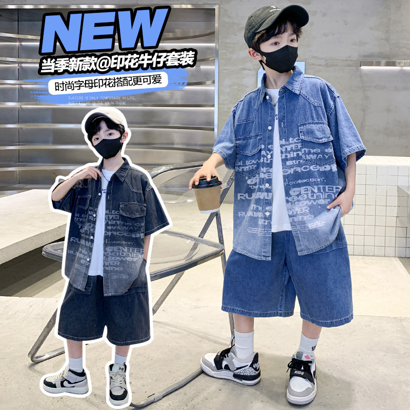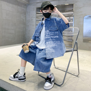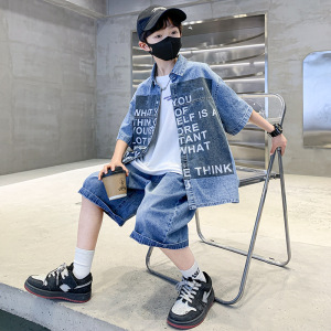 男童夏装套装2025新款中大童夏季薄款男孩儿童牛仔衬衫短袖两件套
