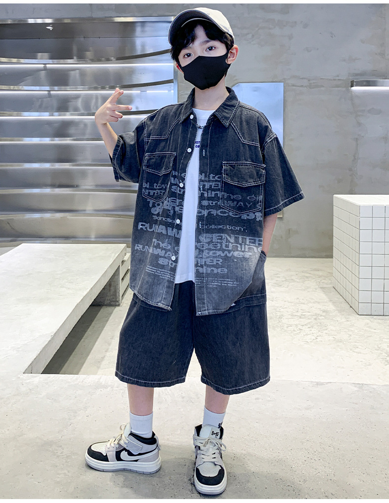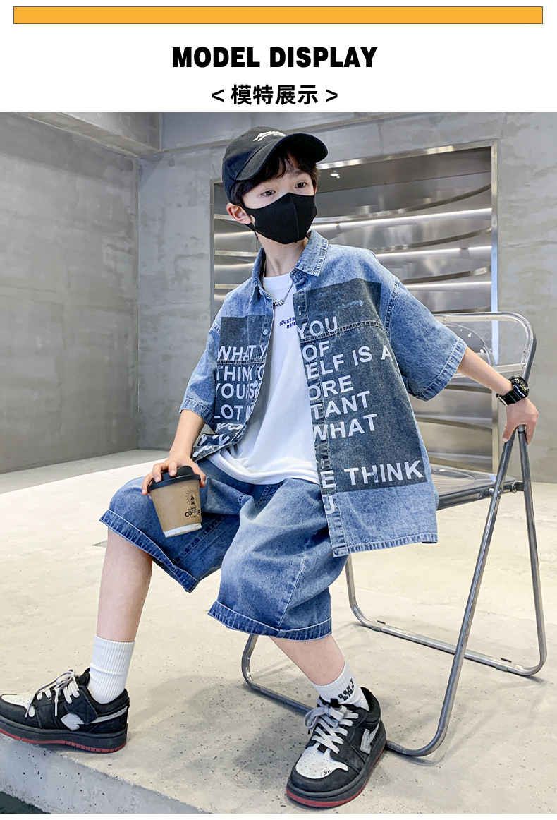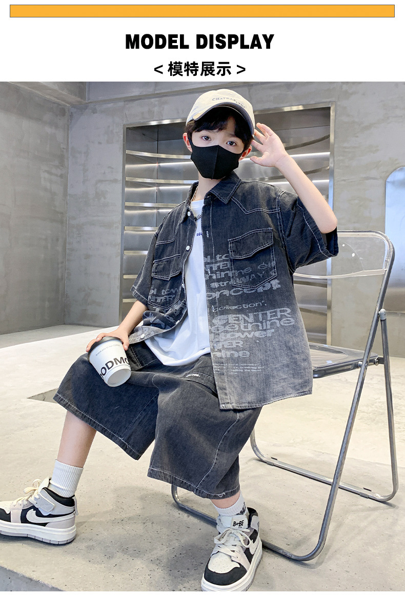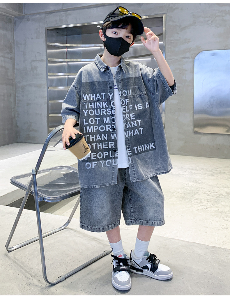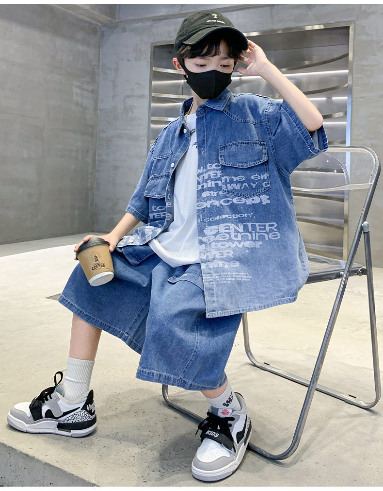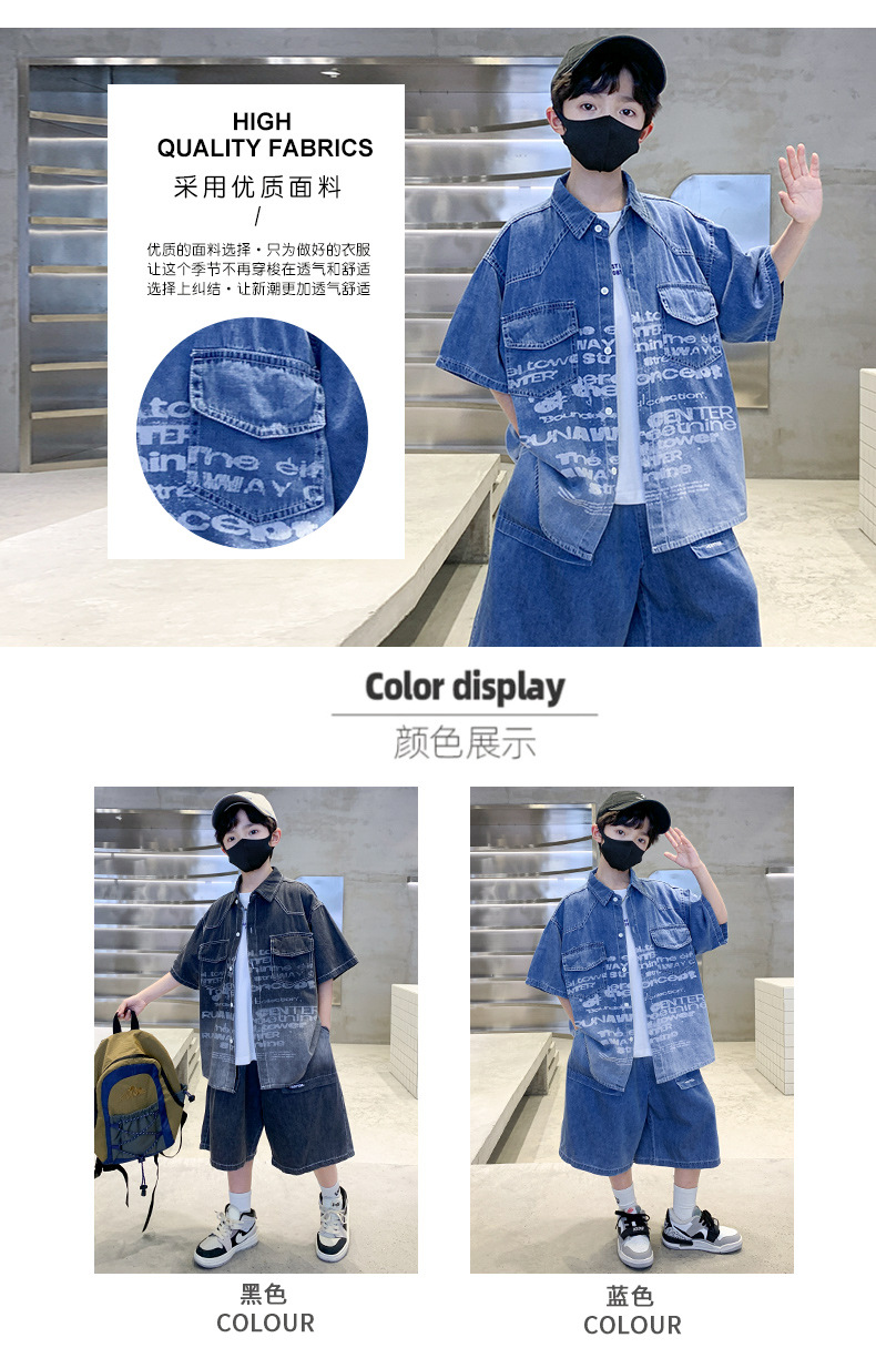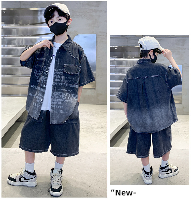 男童夏装套装2025新款中大童夏季薄款男孩儿童牛仔衬衫短袖两件套