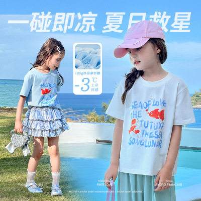 图图小象女童冰感T恤2025春装新款儿童休闲上衣夏季凉感亲子短袖