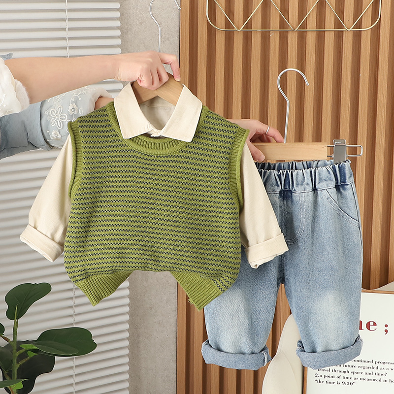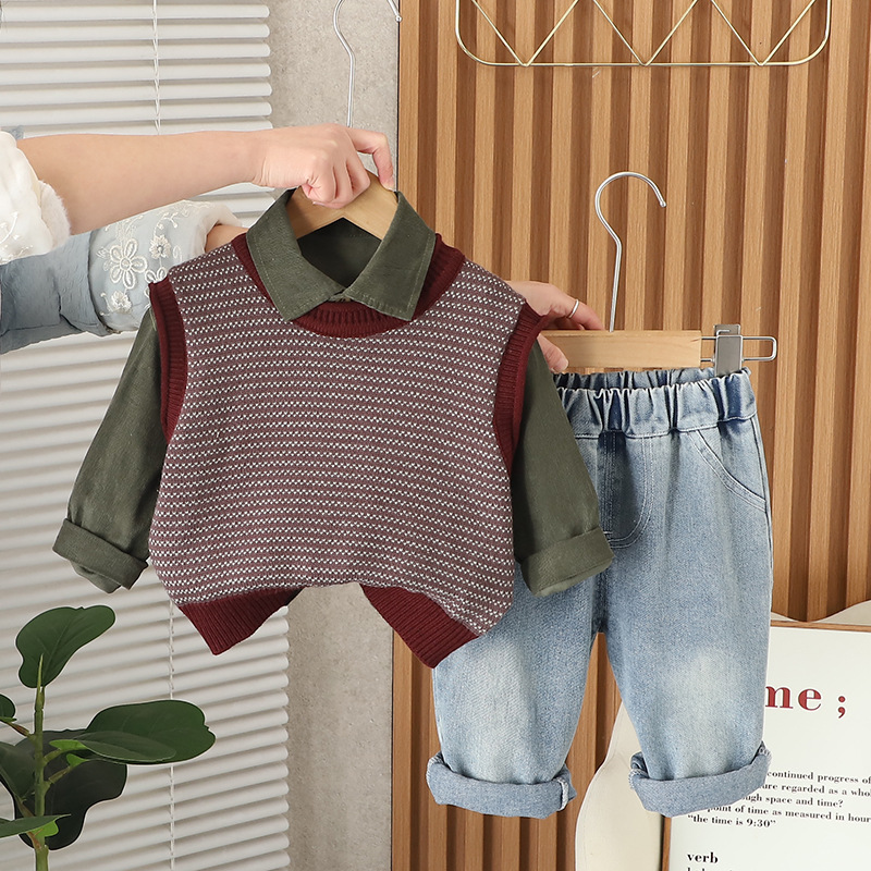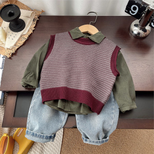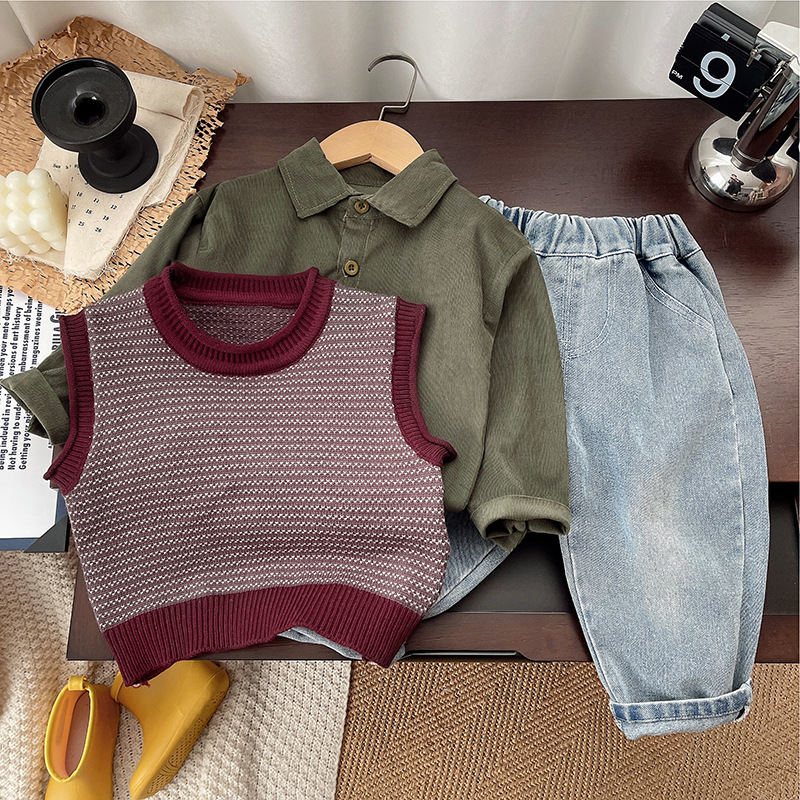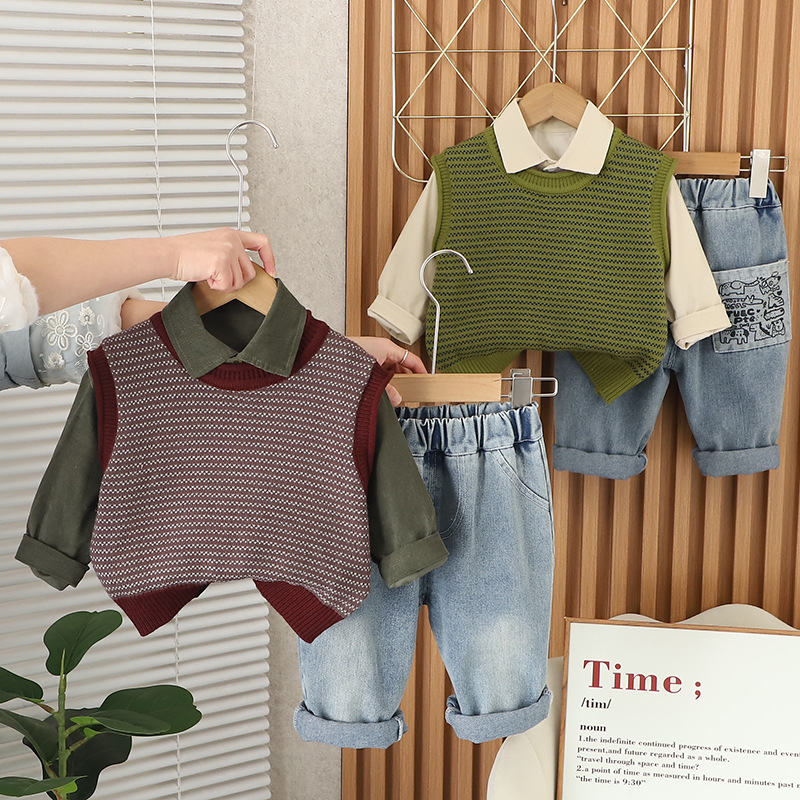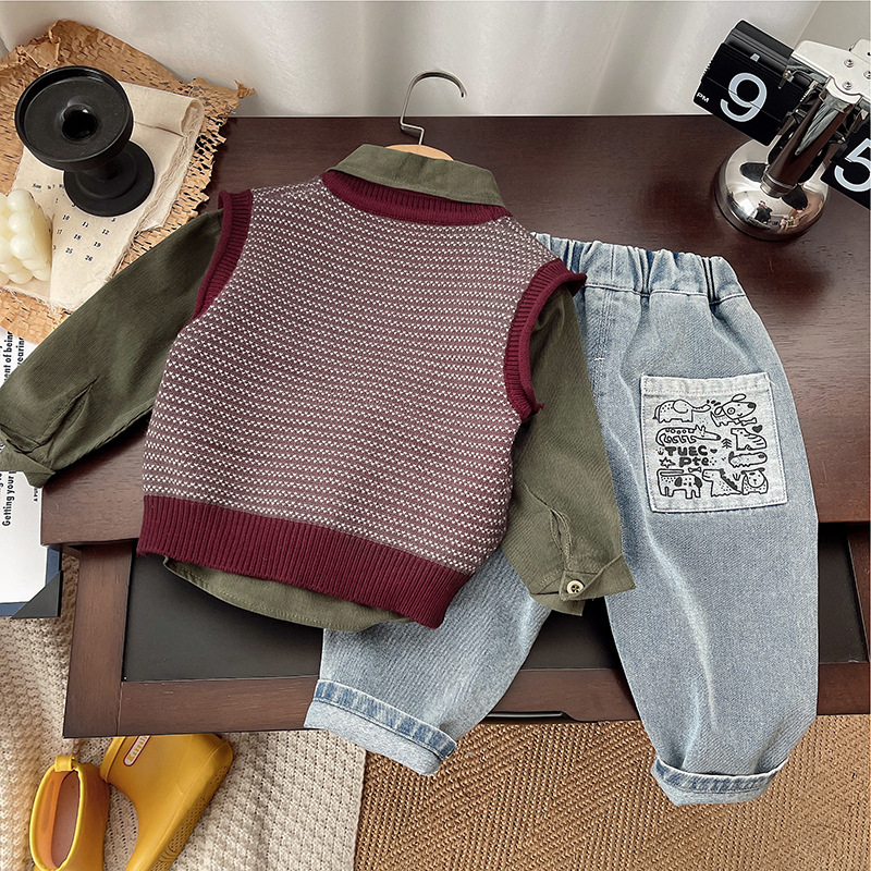 男童套装2025春秋新款儿童毛衣长袖马甲灯芯绒衬衫宝宝休闲三件套