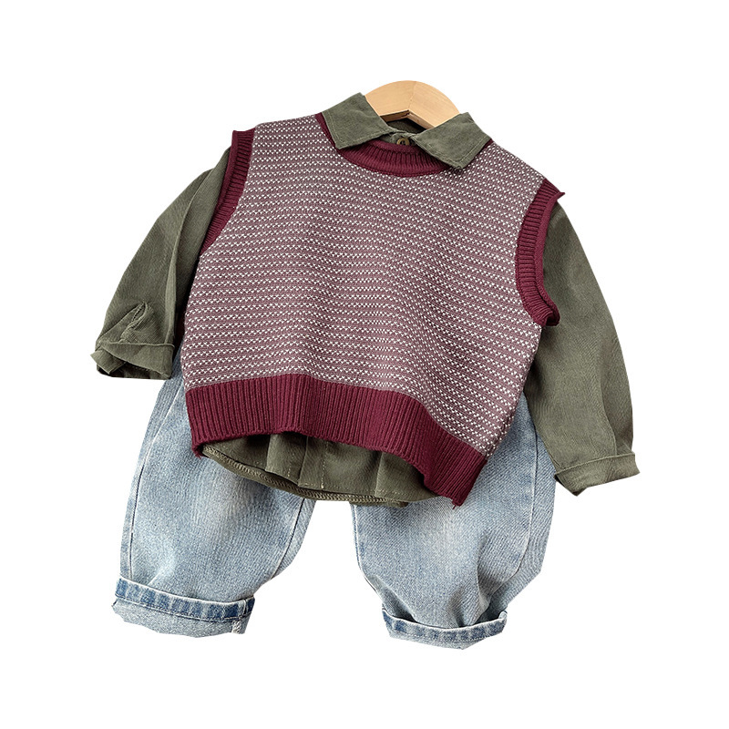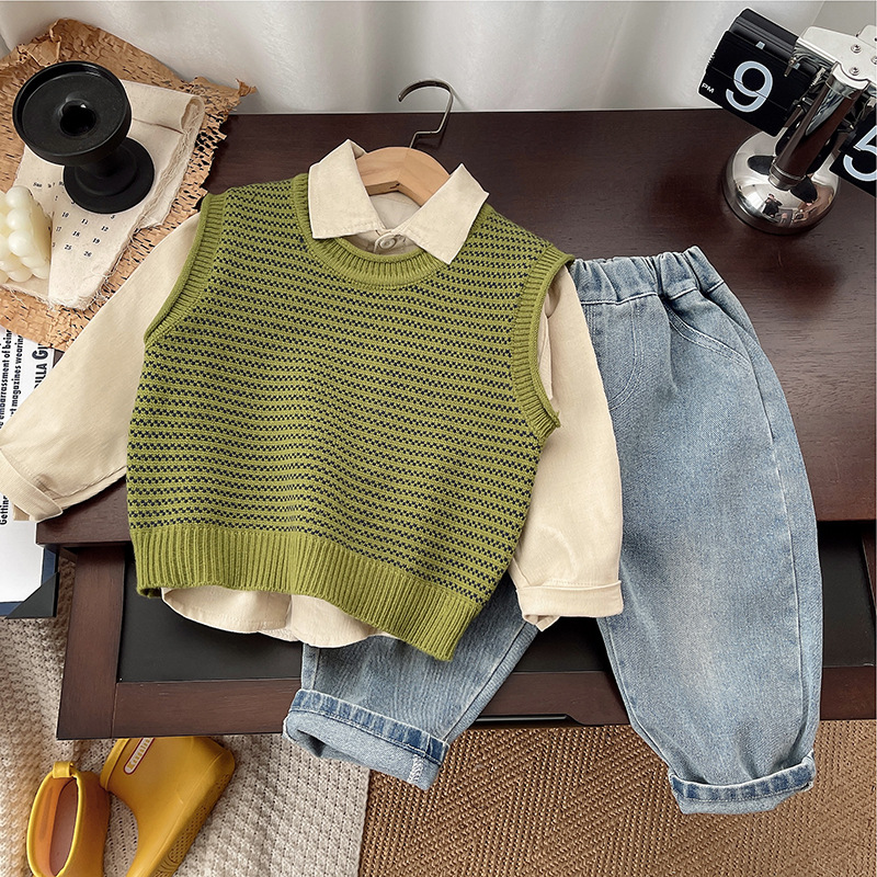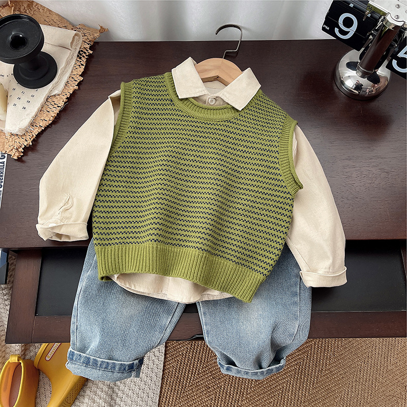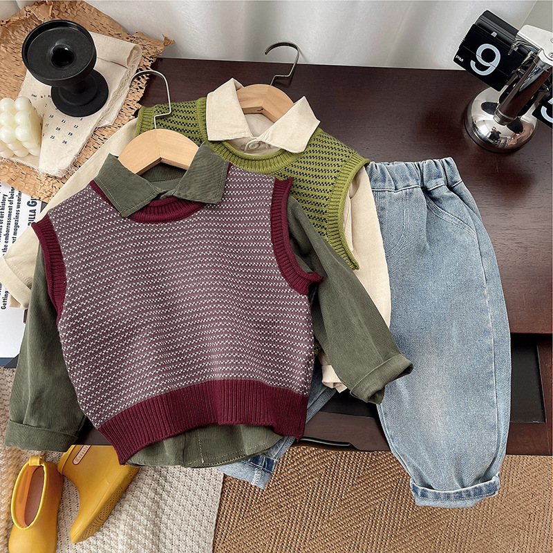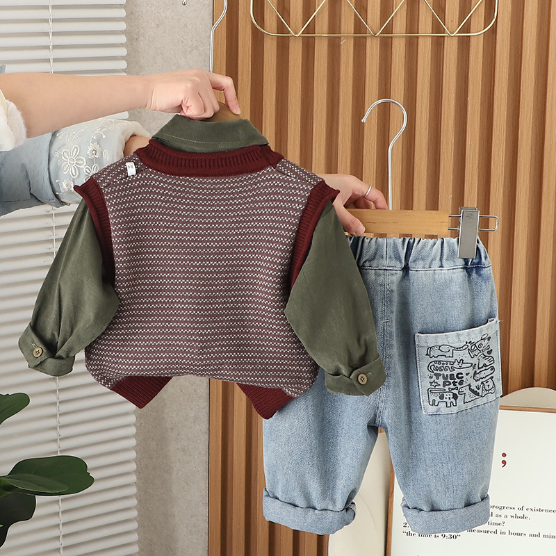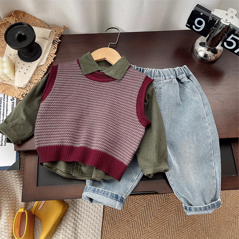 男童套装2025春秋新款儿童毛衣长袖马甲灯芯绒衬衫宝宝休闲三件套