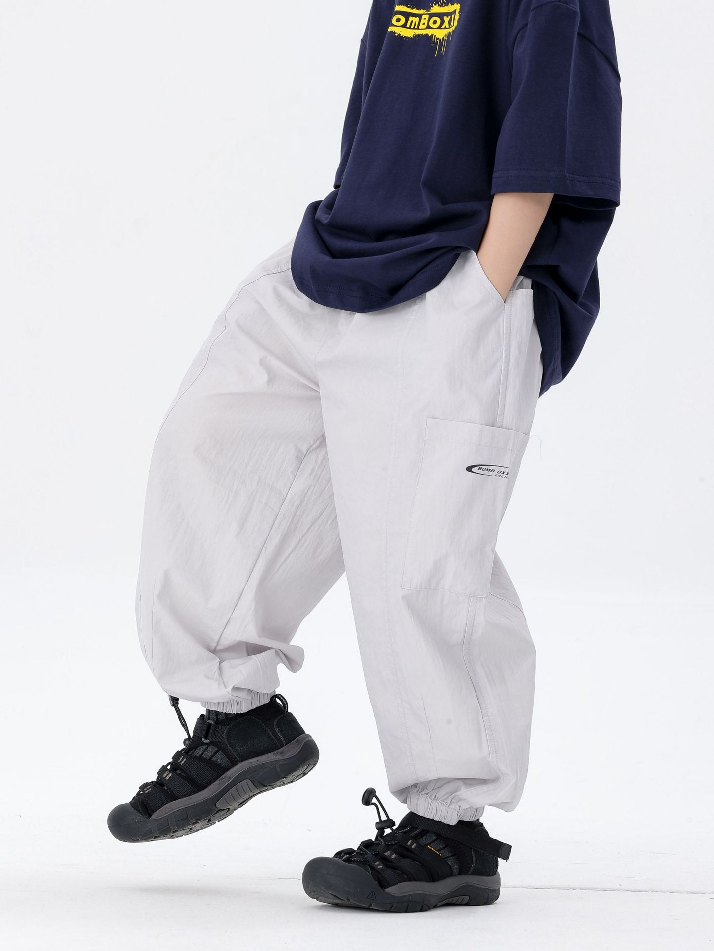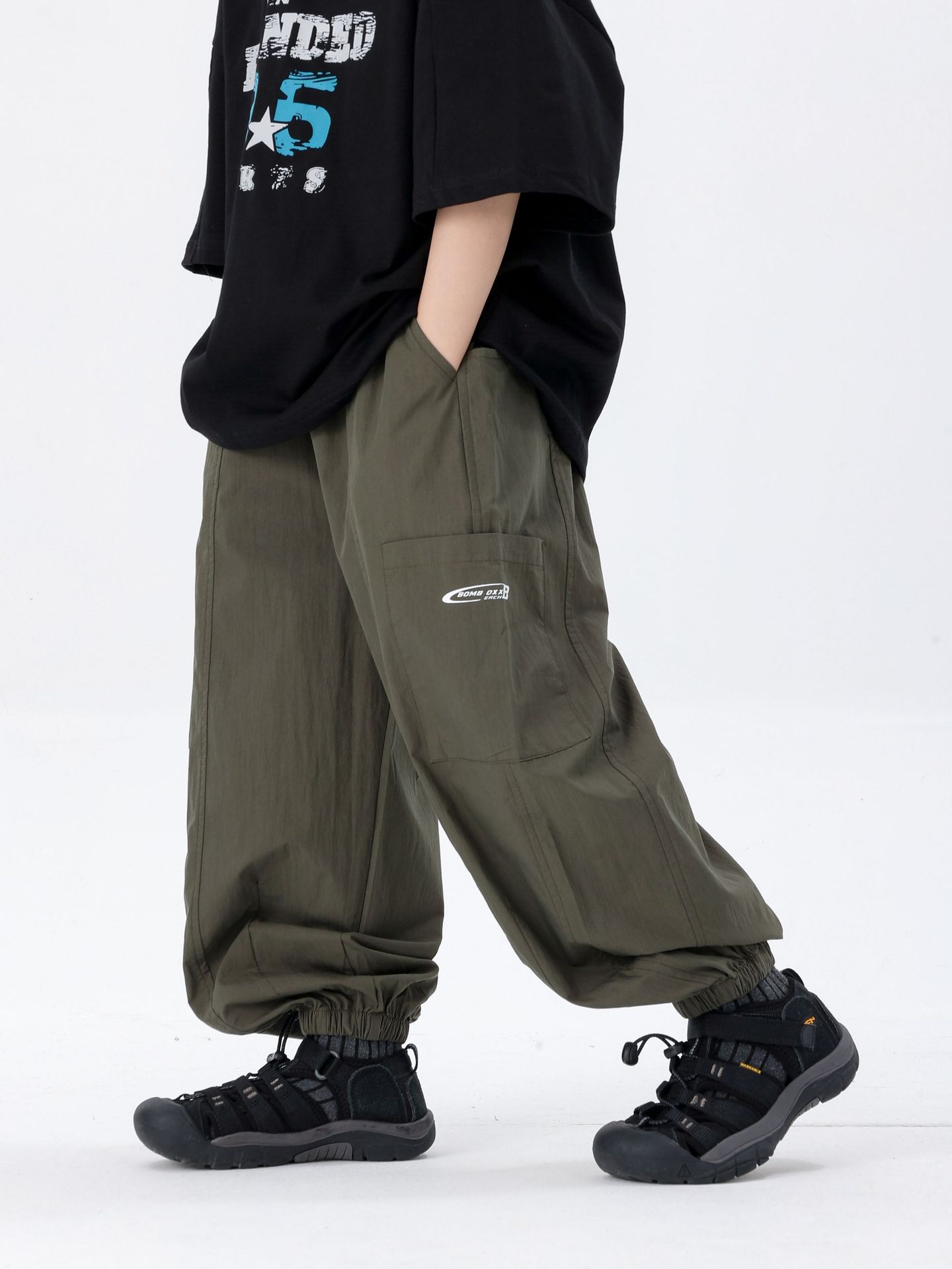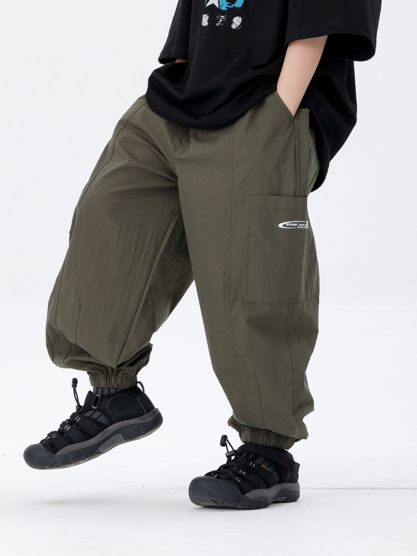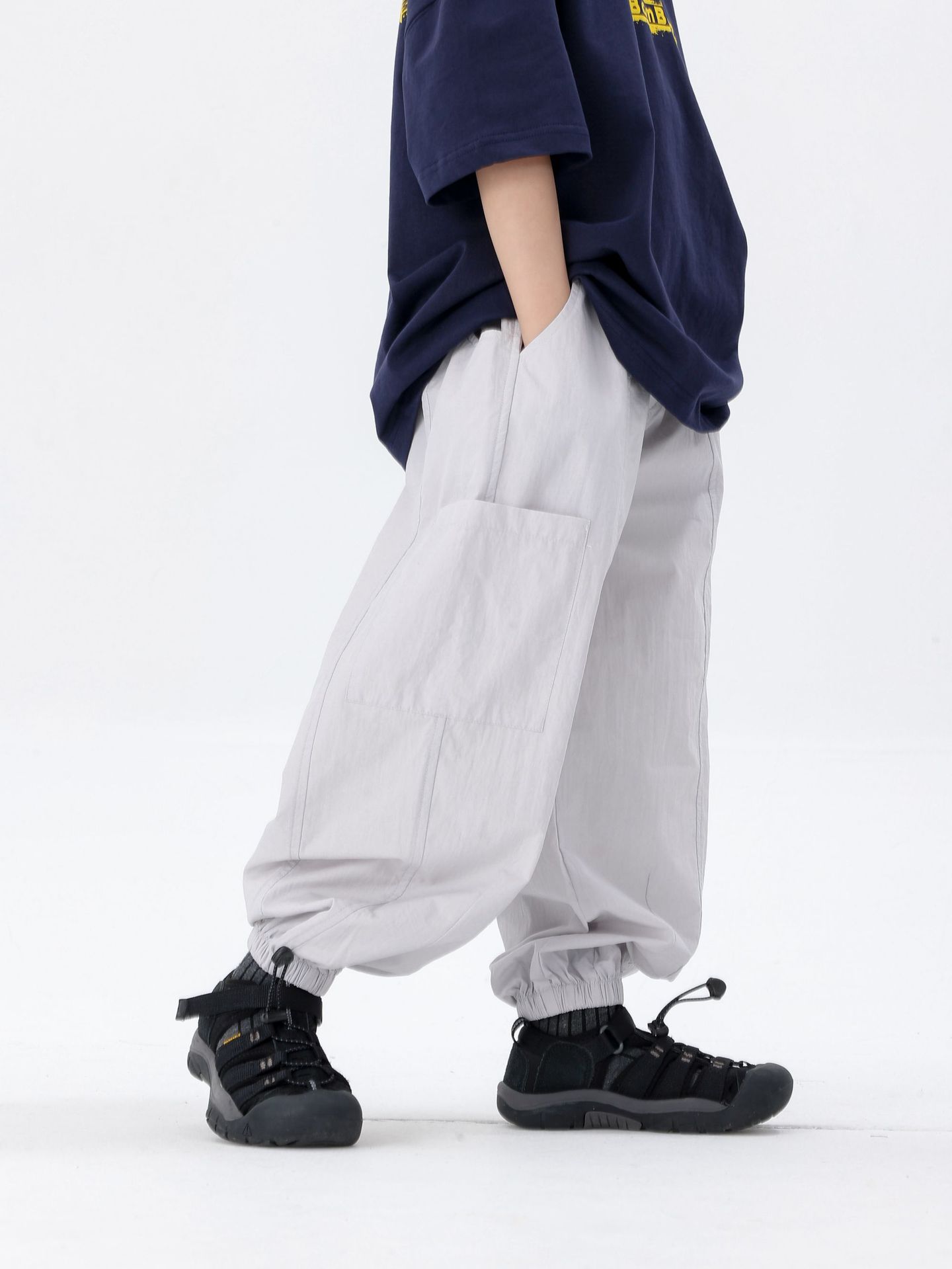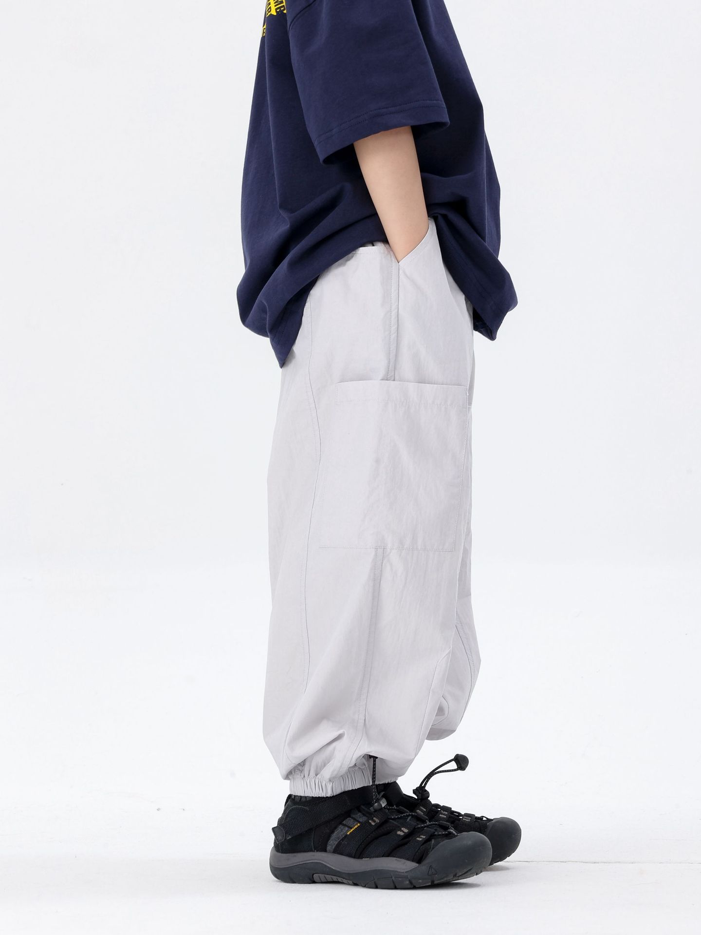 商品名称:25夏季新款童裤束脚男童防蚊裤童休闲裤灰白军绿色简约童裤