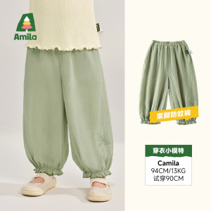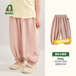 阿米拉童装2025年夏季新款儿童透气束脚防蚊裤男女童动物刺绣裤子