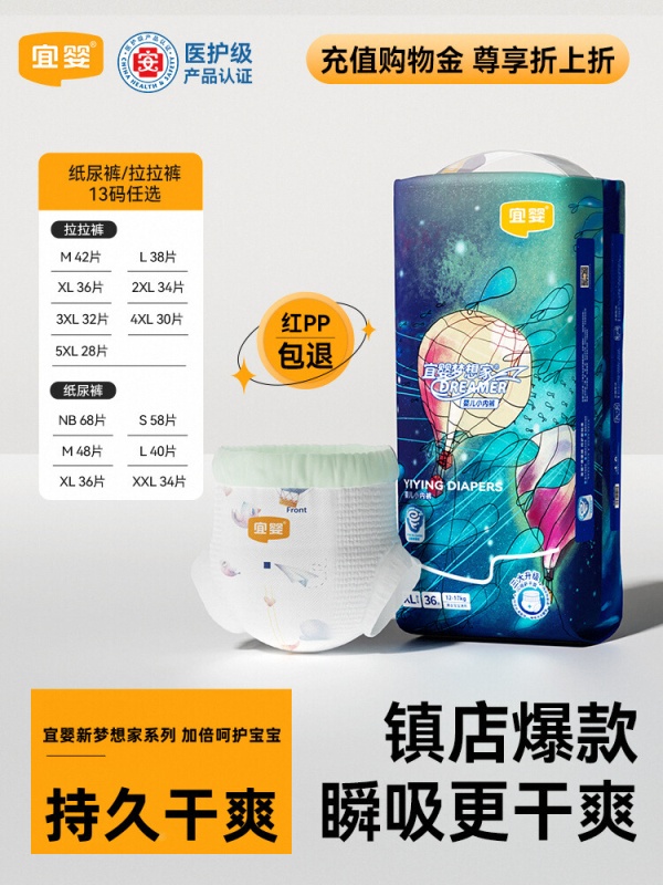 商品名称:宜婴婴儿纸尿裤新梦想家拉拉裤超薄透气尿不湿XL/XXL男女宝宝干爽